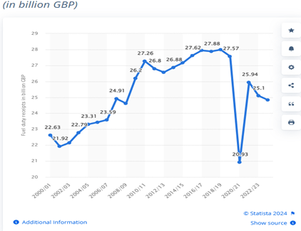 This decline can be attributed to the increasing adoption of electric vehicles (EVs), which do not attract fuel duty. So the revenue from fuel duty is only going to decrease as more and more people shift to Electric Cars.